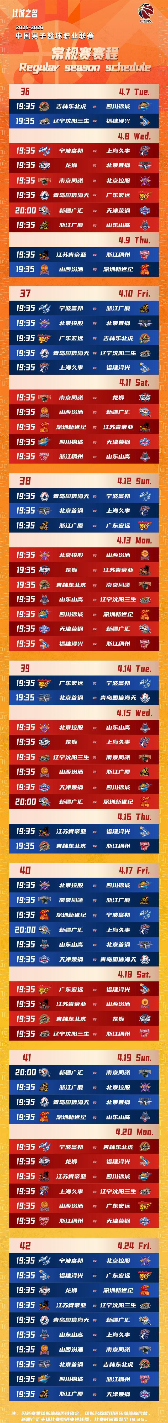 CBA官宣新赛季赛程:12月12日揭幕战广厦战山西4月24日收官