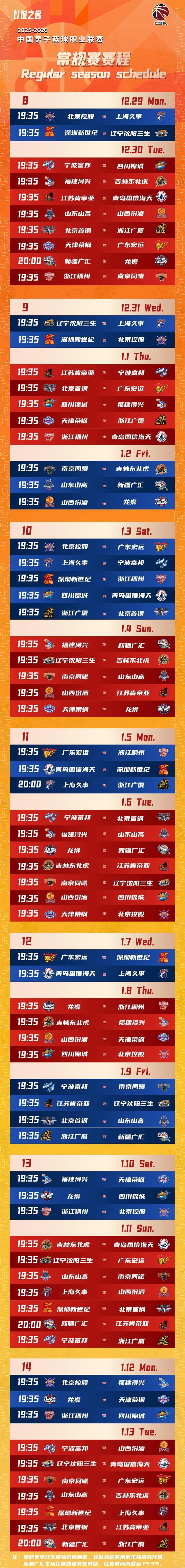 CBA赛程出炉!揭幕战广厦VS山西,跨年大战京粤对决