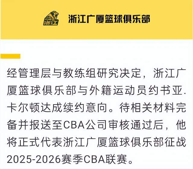 浙江广厦上赛季能够夺冠,外援非常关键,布朗能力毋庸置疑,虽然没有归化成功,但能够续约也是不错的结果。另外几名外援,奈特去了韩国打球,农纳利被放弃,卡尔顿休赛期加盟了香港金牛,由于新赛季CBA和NBL同时进行,也有球迷担心卡尔顿去向。在经过了多次沟通后,卡尔顿还是接受了浙江广厦的报价,而在许钟豪退役的情况下,卡尔顿的续约非常关键,他可以给胡金秋减少很多的压力。
