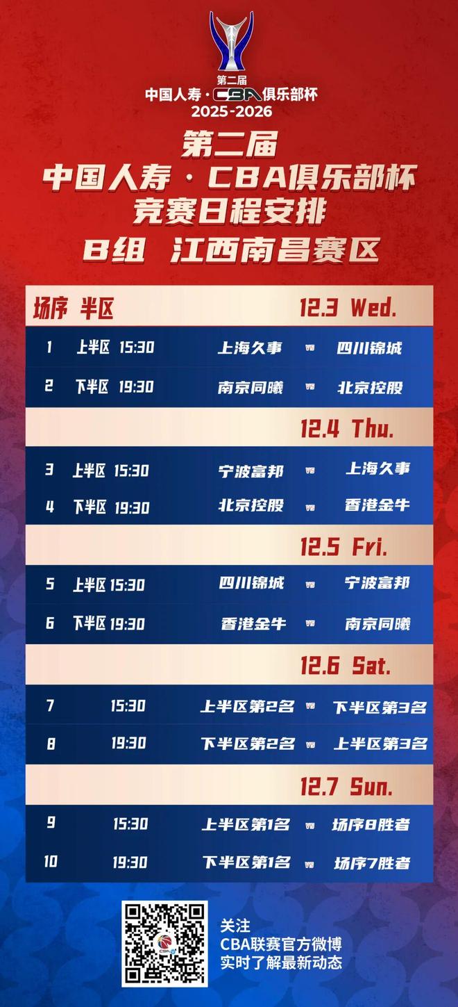 随着赛区结果揭晓, 第二届中国人寿·CBA俱乐部杯赛程也紧随其后公布。届时小组赛将于2025年12月3日-8日在湖南长沙、江西南昌、广西南宁和湖北武汉四个赛区进行。决赛阶段的比赛则将于2026年2月6日-12日在内蒙古自治区呼和浩特市进行。