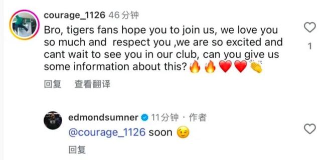 11月17日,目前仍是CBA休赛期。广东队是大家非常关注的,球队这段时间很忙碌,主要是全运会的备战和比赛。现在终于有了结果,在战胜浙江队后,广东男篮成年组拿到了金牌。随着新赛季临近,广东队则开始为CBA备战。现今外援相继报到,此外球迷们一直传的萨姆纳也有新消息,他声称很快到队。具体什么情况呢,有球迷在萨姆纳的社媒留言询问,大致意思是广东队球迷非常希望你能加盟球队,大家非常兴奋,期待能在俱乐部见到你,能给我们一些消息吗?对此萨姆纳回复的很直接,两个字很快。这让广东球迷看到非常兴奋,“这下有底了”,“看来还是要来的”,“应该是达成协议之类的”,大家都是点赞和期待。萨姆纳上赛季效力于四川队,表现非常出色。特别是和广东队的比赛,萨姆纳打爆了后场,几乎没人能防住他,带队高分赢球。之前休赛期传出消息,说有北方球队看上了萨姆纳。不过后来传出更劲爆的,说广东队已经签下了萨姆纳。那么现在真实情况如何呢,虽然萨姆纳的签约权还在四川队手里,但这支队伍看起来新赛季并不想有什么作为。也就是说四川队大概率已经出售了萨姆纳的签约权,而广东队应该是达成了某种协议。萨姆纳的能力摆在那了,毫不夸张的说,他是CBA前五的外援。如果能顺利加盟广东队,那么球队堪称是超级强阵,杜锋冲冠信心更足。不多说,期待萨姆纳的到来。