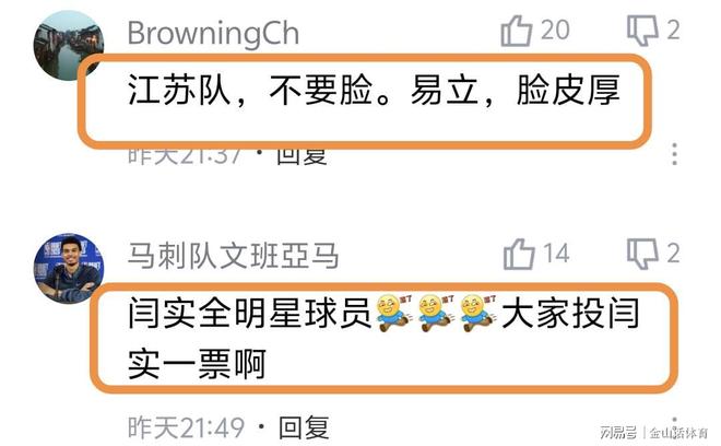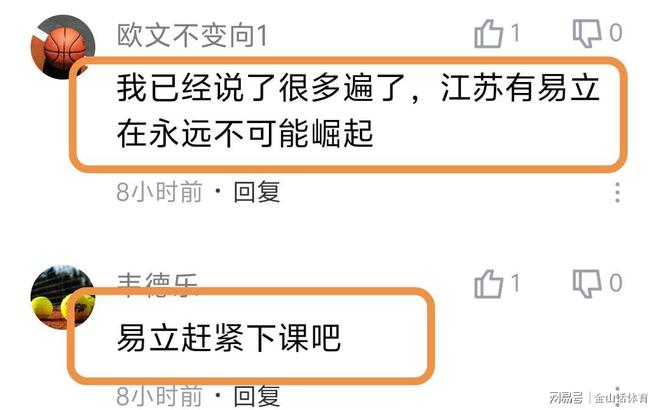 易立率队惨淡的战绩,也被球迷诟病。“江苏队不要脸。易立脸皮厚”;“今年能不能赢下5场”;“易立怎么不会下课的”;“我已经说了很多遍了,江苏有易立在永远不可能崛起”;“易立赶紧下课吧”;“江苏队真的太差了”;“现在的易立成为了新的不倒翁”;“坑爹呀,年年如此”;“没三分球的球队,能赢才怪”;“江苏是教练的问题,还是球员的问题?”……