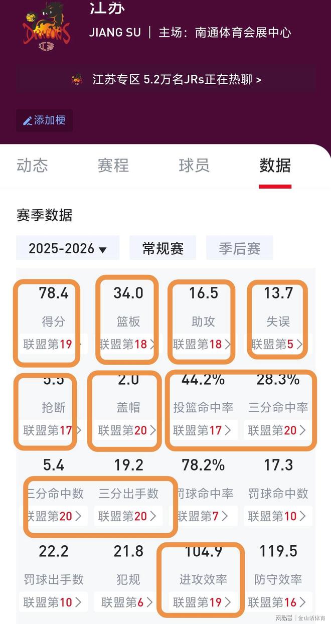 截止CBA联赛第12轮,江苏队战绩为1胜11负,目前排在CBA积分榜倒数第二位,仅次于开赛初期一直用全华班的四川队。而打开江苏队的数据统计,一排排数据惨不忍睹。三分球命中数、出手数、命中率、盖帽数,4项数据均为联盟倒数第一;场均得分、进攻效率,2项数据为联盟倒数第二;场均篮板、助攻,2项数据为联盟倒数第三……
