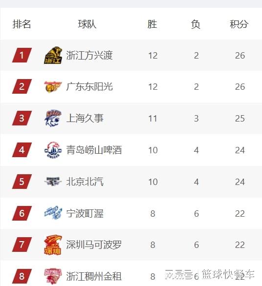 先说说积分榜第一名吧。原本这个位置是属于上海队的,不过,他们这一轮比赛爆冷输给了深圳队,战绩变成11胜3负,排名从积分榜榜首下滑到第三名。而在上海队输球后,卫冕冠军广厦则乘胜追击,他们这一轮比赛面对新疆队。尽管球队已经十年没有在客场掀翻过新疆队,不过,广厦这一战还是顶住压力,在前三节落后的不利局面下,末节轰出一波24-10的攻击波,彻底锁定胜局。球队目前的战绩为12胜2负,冲上积分榜第一的位置。