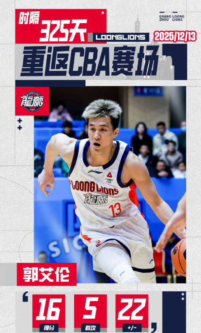 2025年12月13日,郭艾伦时隔325天重返赛场,结果在广州只打了7场比赛就又伤了,本赛季场均22.4分钟,拿到14.1分2.6篮板3.7助攻0.3抢断,命中率46.1%,三分命中率30.8%,罚球命中率71.4%,不知道他本赛季还有没有机会重返赛场。32岁的他是不是真要进入退役倒计时?