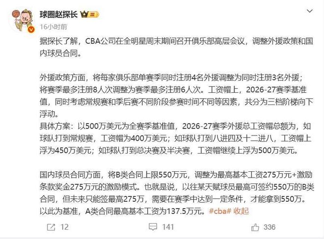 根据篮球媒体人“球圈赵探长”的消息,下赛季CBA将进行较大规模的改革,不仅涉及外援注册和工资帽政策,还有国内球员的薪资体系重新划分,这将进一步推动CBA的健康发展。另外在CBA全明星赛的现场,郭士强指导首次公开回应抢断日本球员,幽默中又有一丝调侃的意味。