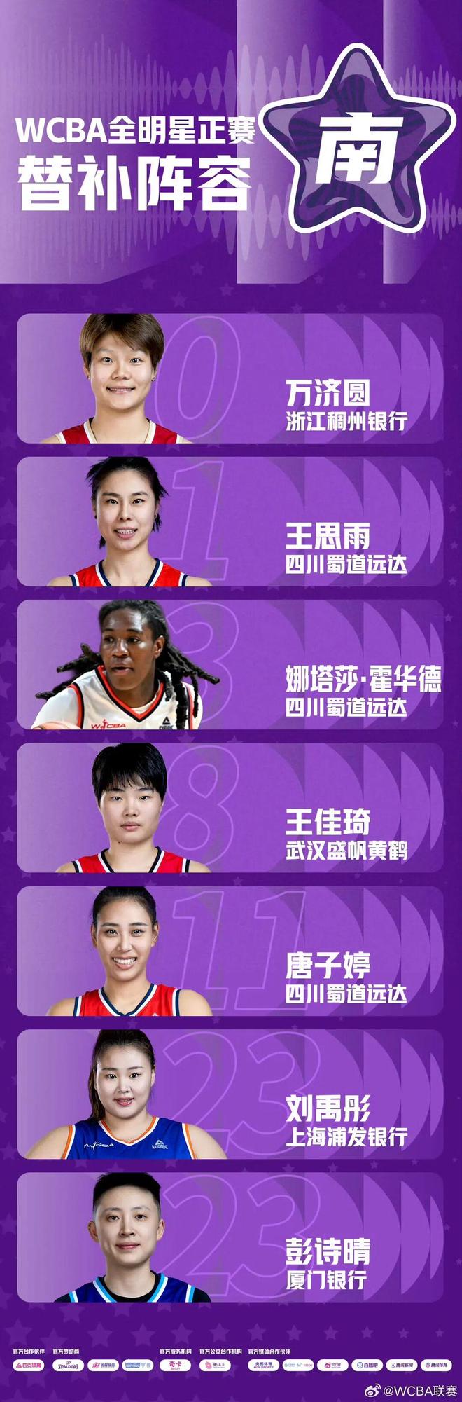 万济圆入选全明星正赛南区替补阵容;李雨汧、代梦帆入选星锐赛南区阵容;董可尔入选三分球大赛;周琪入选技巧大赛。