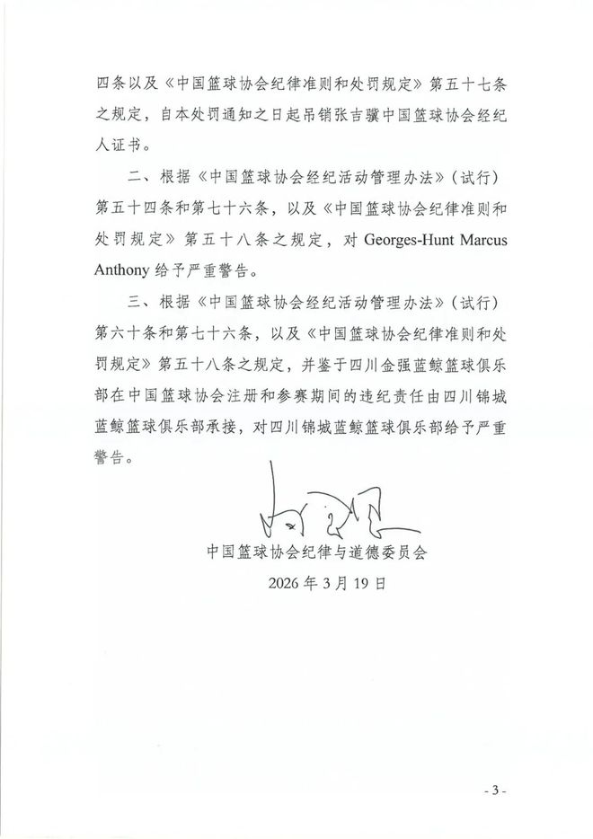 今天四川也吸引了一些目光,但并非什么正面原因。中国篮球协会纪律与道德委员会发布处罚决定:因合同造假、手续缺失而严重违规,吊销了张吉骥的经纪人证书;因未依规办理手续,对马库斯·亨特给予严重警告;因未尽注意义务和手续缺失,对四川锦城蓝鲸俱乐部给予严重警告。