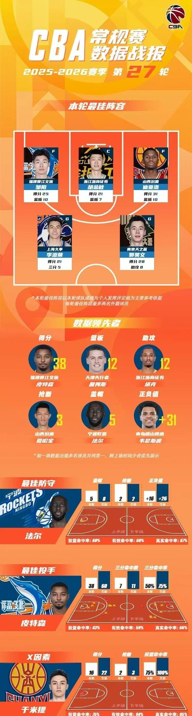 CBA官宣常规赛第27轮最佳阵容,邹阳轰下25+10,尤其是末节独得12分,帮助福建爆冷战胜北京,领衔入选最佳阵容。此外,胡金秋、郭昊文、李添荣与迪亚洛也入选最佳阵容。