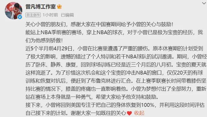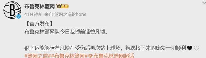 美记Slater:篮网裁掉曾凡博。紧接着篮网官方确认了该消息。曾凡博工作室对此发表声明称,曾凡博将回到美国专注于把自己的身体恢复至100%。并评估下一步的计划。9月23日与篮网签约,10月15日被裁,曾凡博为期22天的追梦之旅结束了,期间就为球队打了一场在中国澳门举办的NBA季前赛出战约10分钟没有出手0分0板0助0断0帽进账。篮网果然如外界预期中急不可耐,前脚打完中国赛,后脚就把曾凡博给裁掉了,装都不装了。值得一提的是,由于曾凡博之前与篮网签约的是Exhibit 10合同,所以他被裁掉之后,还能选择前往篮网的发展联盟球队长岛篮网打球。如果曾凡博不想征战发展联盟,可以回归CBA继续效力,北京队已经为他进行了新赛季的预注册。北京队肯定希望曾凡博能够回归,他+赵睿+陈盈骏+周琦的组合,在整个CBA堪称最豪华,新赛季非常有望冲击总冠军,不过最终还是会尊重其的个人意愿。如果曾凡博选择回归CBA,中国男篮也能顺理成章征召他出战冲击27年世界杯参赛名额的世预赛,最近几场比赛分别为今年11月28日-12月1日两战韩国,明年2月26日VS日本,以及明年3月1日VS中国台北,每一场都是硬仗。在今年亚洲杯大放异彩的王俊杰,因为要征战NCAA估计打不了世预赛,而曾凡博的进攻能力尽管没有前者那么多样性,可他的防守三分空切运动能力同样至关重要,在此前的比赛已经得到了验证。2003年1月11日出生的曾凡博,今年22岁,身高2米08的三至四号位摇摆人,曾经的全美四星高中生,在杨瀚森之前他才是中国篮坛的当红炸子鸡,一样被认为能够打进NBA,可惜现实总是比理想残酷。实在不行回家吧,在CBA和国家队照样可以实现自己的价值以及兑现自己的天赋,NBA也好世界最高篮球殿堂也罢就当做一场可望而不可及的梦。