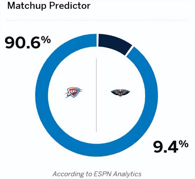 赛前,美媒ESPN预测了本场比赛的胜率:鹈鹕队胜率仅有可怜的9.4%,雷霆胜率则高达90.6%,这预测差距也是头一次见。首发阵容方面,雷霆队这边,排出的最新首发五人组为:谢伊-吉尔杰斯-亚历山大、阿杰伊-米切尔、卡森-华莱士、多尔特和以赛亚-哈尔滕施泰因;鹈鹕队这边,首发阵容则为:费尔斯、琼斯、墨菲、奎因、米西。