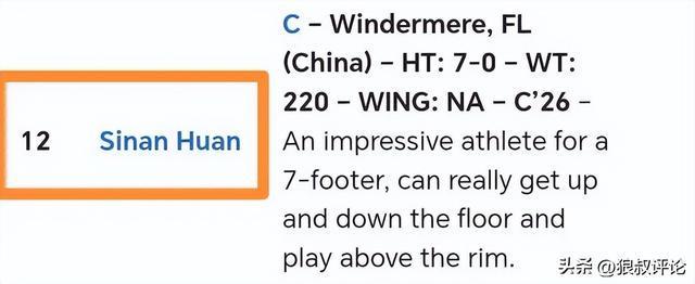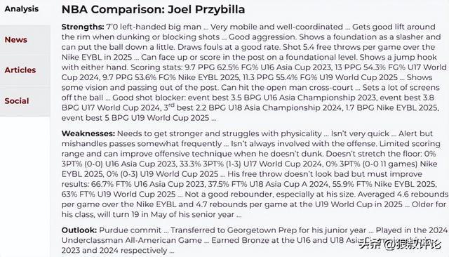 具体评价如下:优势:一名身高约2米13的左撇子大个子球员,机动性很强且协调性出色,在扣篮或封盖时起跳充分,具备良好的侵略性。展现出作为空切手的基础,并且可以稍微运一下球。造犯规能力不错,在2025年耐克EYBL联赛中场均获得5.4次罚球,具备面框或低位背身得分的基础。能使用任一手完成跳勾。得分数据如下:2023年U16亚洲杯场均9.7分,命中率62.5%;2024年U17世界杯场均13分,命中率54.3%;2025年耐克EYBL场均9.7分,命中率53.6%;2025年U19世界杯场均11.3分,命中率55.4%,展现出了一定的视野和低位策应能力。能够传球找到对侧的空位队友…频繁进行无球掩护、出色的盖帽手:2023年U16亚洲锦标赛场均3.5次盖帽(赛事最佳);2024年U17世界杯场均3.8次盖帽(赛事最佳);2024年U18亚洲锦标赛场均2.2次盖帽(赛事第三);2025年耐克EYBL场均1.7次盖帽;2025年U19世界杯场均5.0次盖帽(赛事最佳)。劣势:需要变得更强壮,在与身体对抗强的对手对位时表现挣扎,横移速度不算很快,虽然警觉但接球失误较为频繁,在进攻中并不总是参与感很强。得分范围有限,并且在非扣篮终结时,其进攻技术有待提高。不具备拉开空间的能力:2023年U16亚洲杯三分命中率0%(0投0中);2024年U17世界杯三分命中率33.3%(3投1中);2025年耐克EYBL(11场比赛)三分命中率0%(0投0中);2025年U19世界杯三分命中率0%(3投0中)。他的罚球动作看起来不差,但必须提升命中率:2023年U16亚洲杯罚球命中率66.7%;2024年U18亚洲杯A级赛罚球命中率37.5%;2025年耐克EYBL罚球命中率55.9%;2025年U19世界杯罚球命中率63%。对于他的身材来说,不是一个好的篮板手。在2025年耐克EYBL中场均4.6个篮板,在2025年U19世界杯中场均4.7个篮板,在他的年级中年龄偏大,将在高四那年的5月份年满19岁。前景展望:已承诺加盟普渡大学…高中三年级时转学至乔治城预科学校,参加了2024年全美低年级学生全明星赛,分别在2023年和2024年随队获得U16和U18亚洲锦标赛铜牌。