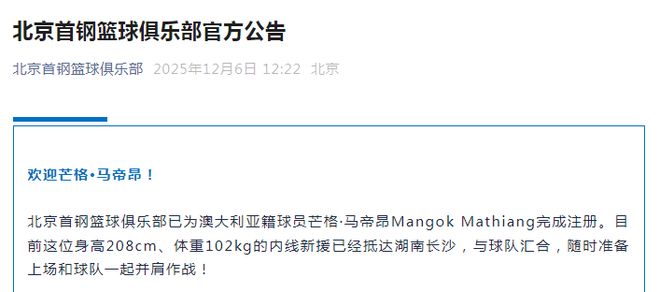 北京男篮官方晒出马帝昂加盟的海报,且前一天CBA官网已经更新注册信息,北京男篮已经为马帝昂完成注册,他将成为新赛季球队的第4位外援,前三位外援分别是:杰曼、奥莫特与斯佩尔曼。北京男篮官方公告表示:北京首钢篮球俱乐部已为澳大利亚籍球员马帝昂完成注册。目前这位身高208cm、体重102kg的内线新援已经抵达湖南长沙,与球队会合,随时准备上场和球队一起并肩作战!
