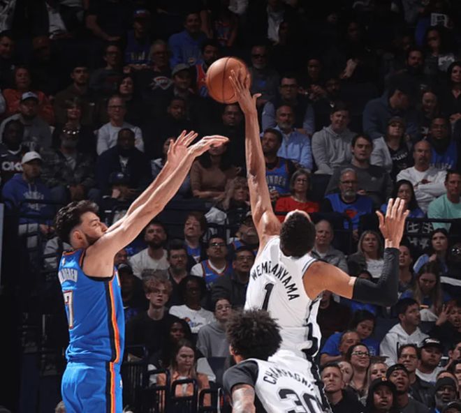 次节回来,文班亚马低位扛着切特,转身抛投丝滑再打进,真是硬气。紧接着,文班亚马强攻欲隔扣切特,反遭对手大帽拍飞在地,回放这个球却有犯规嫌疑,推人了。下一回合切特持球,文班直接将其推出底线,裁判立即响哨。文班真生气了,切特三分线外投篮,文班补防送上遮天大帽。尚帕尼连续投进2记三分,马刺再次追平雷霆。文班跳起抢板,亚历山大倒地夹住其脚导致摔倒,这个动作太危险了。切特小打大造成尚帕尼犯规,半场战罢,雷霆55-52领先马刺3分。