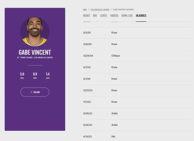 在美国basketball-reference数据网站的DBPM(每百回合防守影响力)方面,文森特以-1.6评分在湖人队内排名倒数第4,仅领先小尼克-史密斯-2.5、八村塁-2.1、克内克特-2,整体防守效率惨不忍睹.