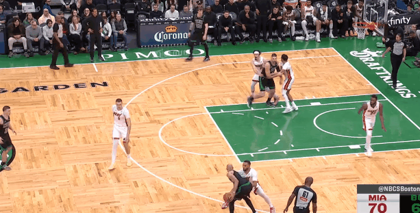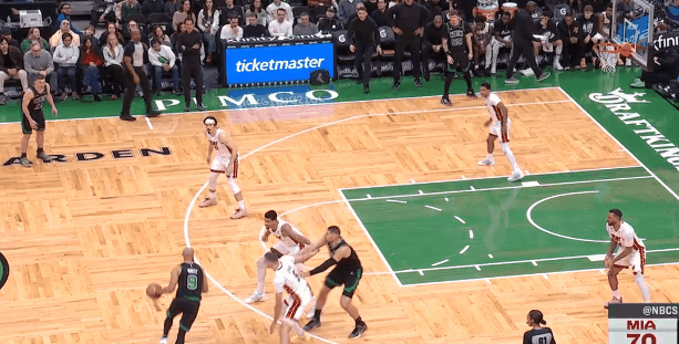 第四节最后,凯尔特人95比96落后,武切维奇临时上场,跟杰伦·布朗跑个二人转,接回传,喂底角怀特,射中事实上的制胜球。
