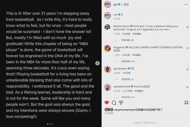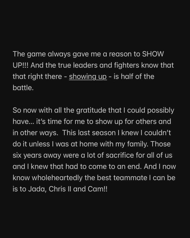 作为"NBA球员"的这一篇章已经结束,但篮球这项运动,早已刻进我的DNA,永远不会离开我。
