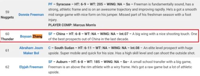 美国知名模拟选秀网站NBA Draft Room最近又更新了2027年NBA模拟选秀榜单,张博源的名字出现在了榜单上,他被预测于2027年次轮第60顺位被俄克拉荷马城雷霆队选中。