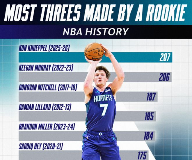 这样一来,克尼普尔的NBA生涯三分球命中数就达到了209个,正式超越了萨克拉门托国王队的基根-穆雷的206个,成为NBA史上新秀三分王。要知道,克尼普尔只打了59场常规赛,而基根-穆雷用了80场常规赛。