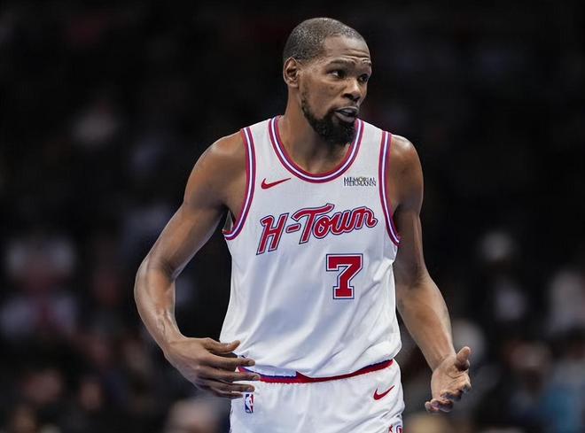 火箭队内外线攻防不尽如人意,申京14中6,阿门16中7,谢泼德14中5,火箭三少的表现都不及格,老将杜兰特是火箭队唯一的遮羞布。上半场,杜兰特的三分球是火箭队的及时雨,独砍14分3板5助2帽,正负值高达+17,扮演定海神针的角色;下半场,杜兰特得分组织一把抓,既当爹又当妈,为火箭队续命;但到了末节决战,斯波派重兵围剿杜兰特,彻底掐住了火箭队的命门,火箭队进攻体系彻底失去了运转能力。