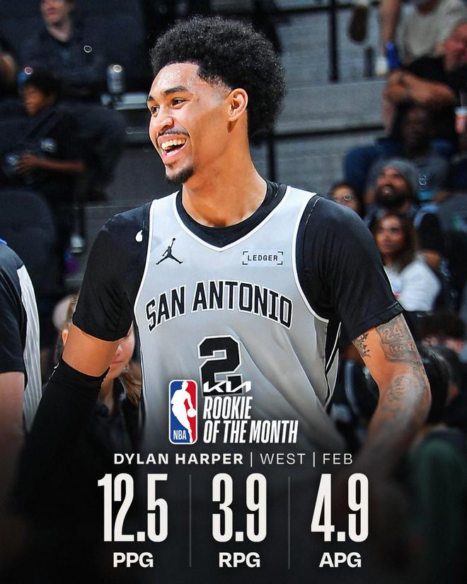 马刺在2月则取得了11战全胜的完美战绩,其中迪伦-哈珀场均贡献12.5分3.9篮板4.9助攻,最终他也被评为了NBA2月西部最佳新秀。