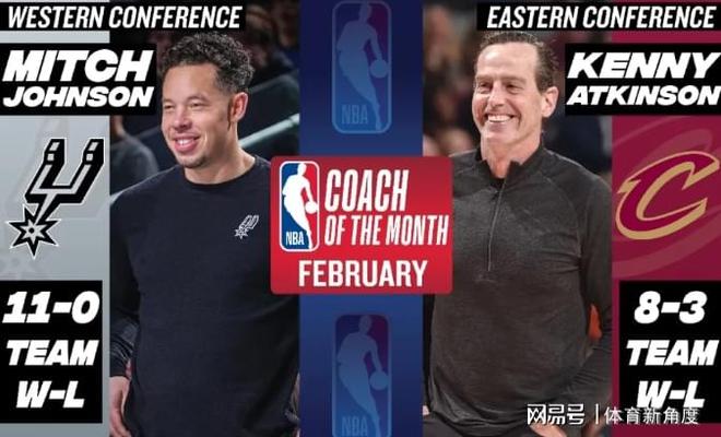 2月最佳球员榜单上,西部马刺队的文班亚马与东部活塞队的坎宁安双双入选;2月最佳防守球员方面,西部马刺的文班亚马再度上榜,东部则是凯尔特人的德里克 - 怀特获此殊荣;2月最佳新秀的桂冠,被西部马刺的哈珀与东部黄蜂的克努佩尔摘得;而2月最佳主帅,则花落西部马刺的米奇 - 约翰逊与东部骑士的阿特金森。