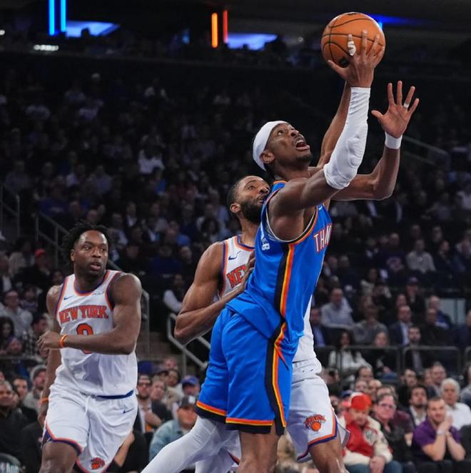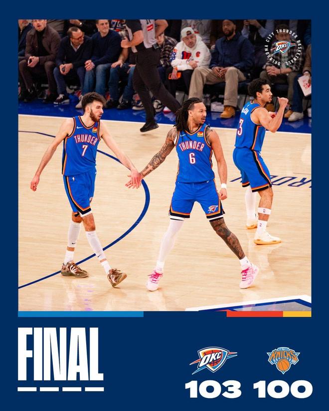 哈特上篮取分,随后2罚全中,多尔特连续犯规,亚历山大轰进远投。哈特篮下取分,布伦森制造了多尔特的进攻犯规,后者6次犯满离场。布伦森跳投得手,霍姆格伦单打不进,哈特抢下篮板,距离终场仅剩6秒,尼克斯落后3分并请求暂停。布伦森、阿奴诺比相继绝平远投不进,比赛时间走完。最终,雷霆以103比100险胜尼克斯,得以迎来4连胜。纽约的3连胜被终结。