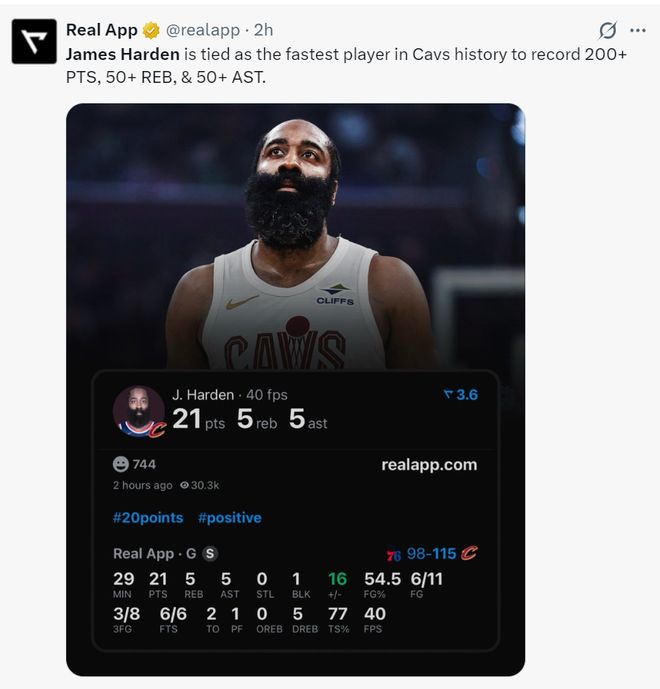 6.11场比赛完成200分50篮板50助攻并列骑士队史最快;