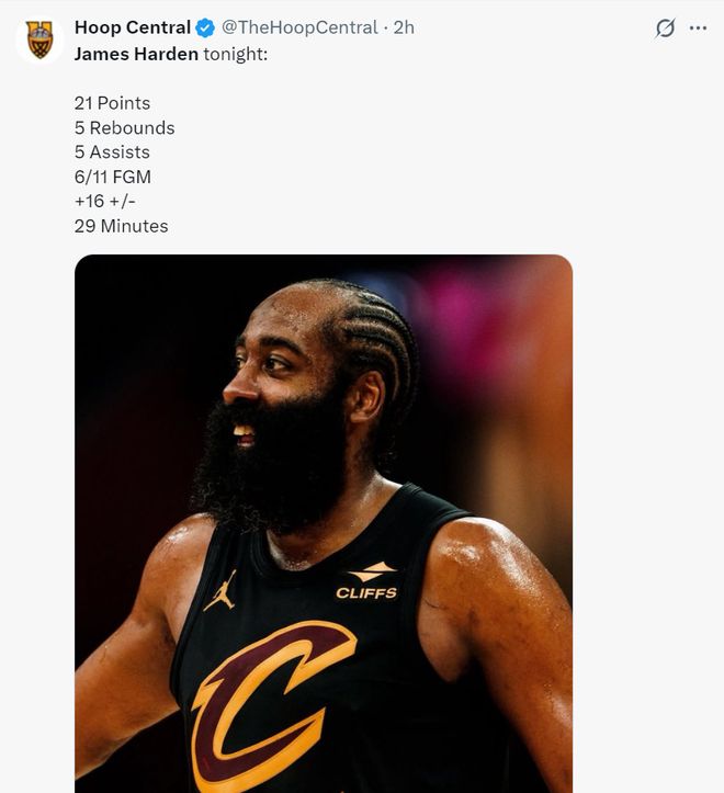 哈登在加盟骑士后,他登场的比赛9胜2负,他场均19.3分5.0板7.8助,命中率46.4%,三分命中率43%,罚球命中率82%。