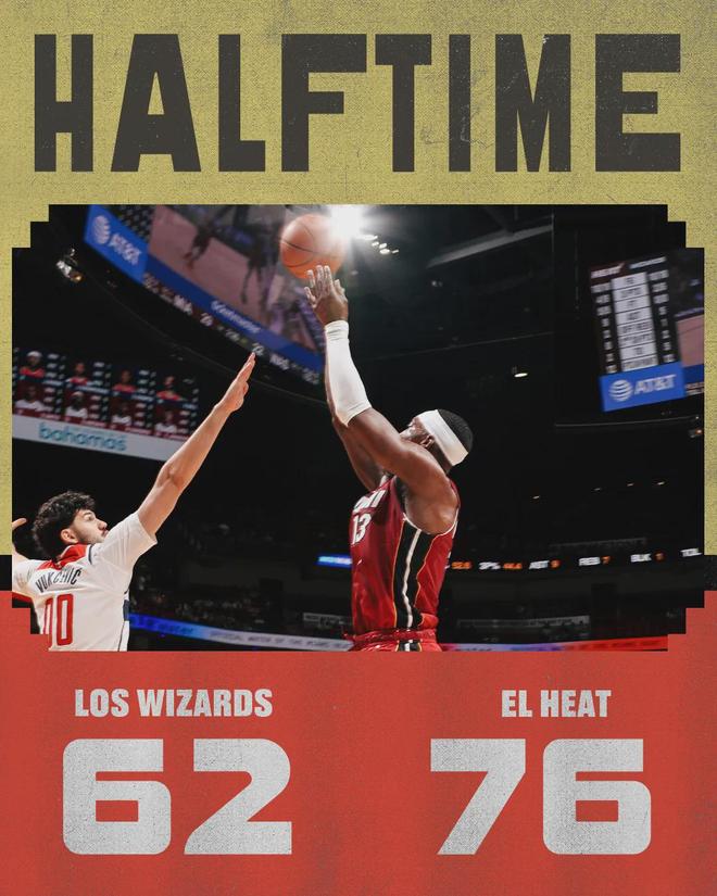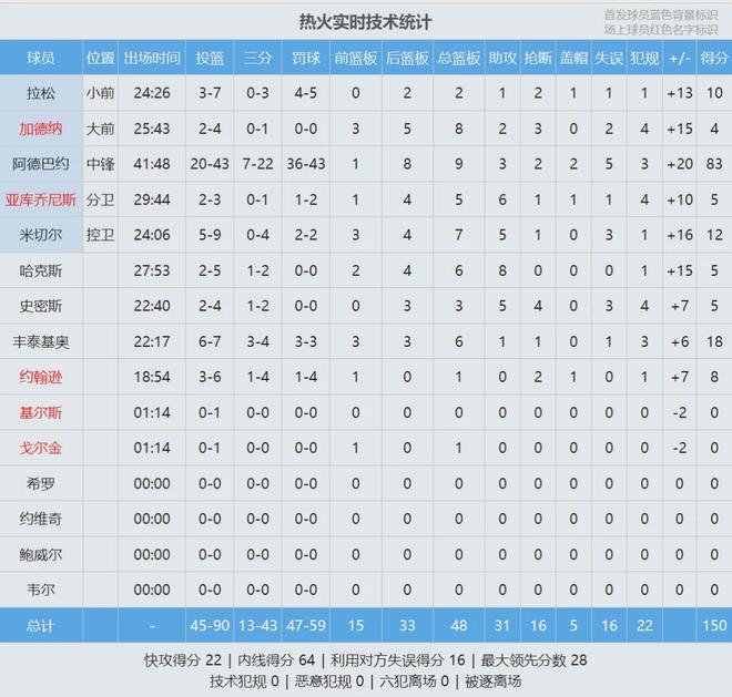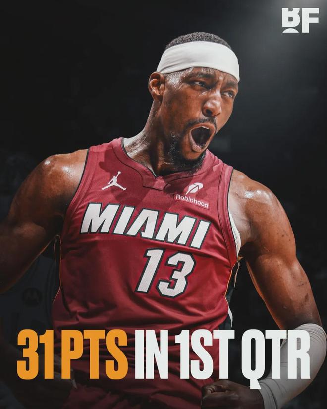 第一节热火40-29领先奇才11分,阿德巴约投篮16中10,三分8中5,罚球7中6,单节砍下31分3篮板1抢断1盖帽。自1996-97赛季有统计以来,阿德巴约首节31分排名历史第二,仅次于乐福的34分。注意:这是首节得分,不是单节。