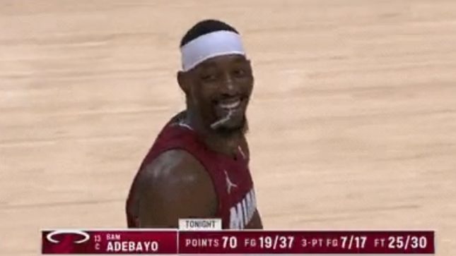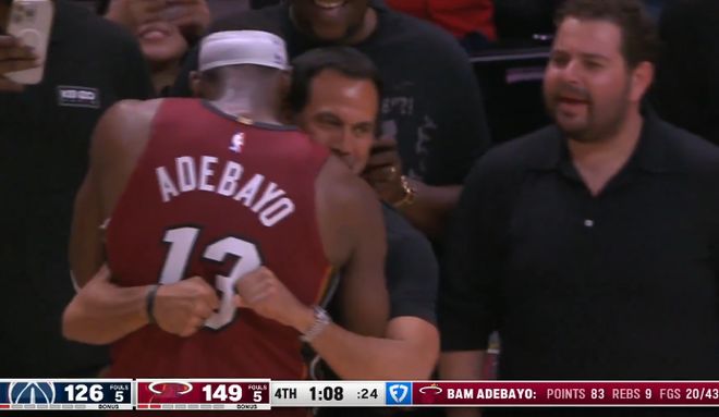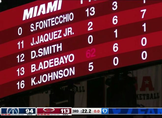 到了最后2分钟,当阿德巴约拿到个人第79分,热火不断砍奇才球员就是为了换球权给阿德巴约得分。