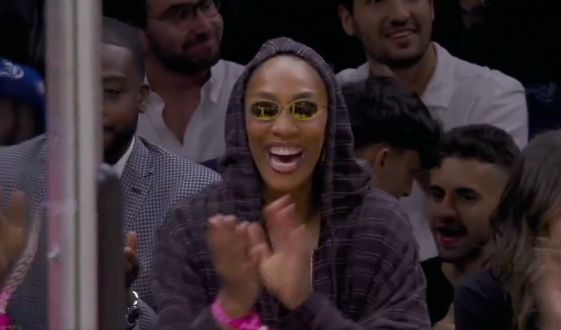 当阿德拿到60+之后,看看场边阿德巴约的女友,现役女篮第一人阿贾-威尔逊多开心。(差点没看出是女人)