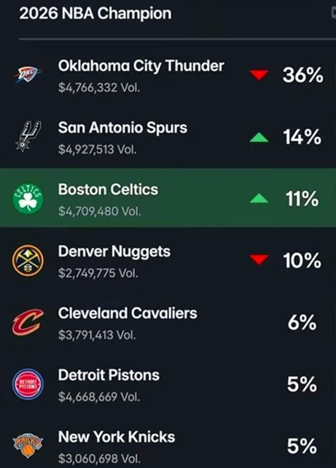 毫无疑问,榜首的位置属于卫冕冠军雷霆,在遭遇严重伤病打击的情况下,雷霆队依旧牢牢占据联盟第一位置,亚历山大经历夺冠洗礼后进一步蜕变,这让他们在夺冠概率方面断档领跑。