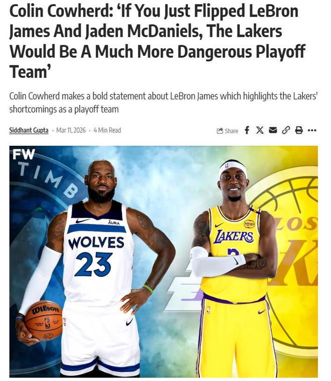 詹姆斯缺阵期间,湖人队的进攻效率有所提升,防守执行力也有所提高。在湖人120-106大胜森林狼的比赛后,NBA名嘴科林·考赫德公开表示,如果湖人队用杰登·麦克丹尼尔斯代替勒布朗·詹姆斯,湖人更有夺冠威胁性。现在詹姆斯在湖人的价值甚至不足以与一位角色球员媲美……