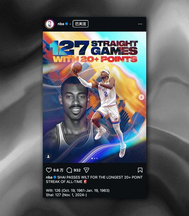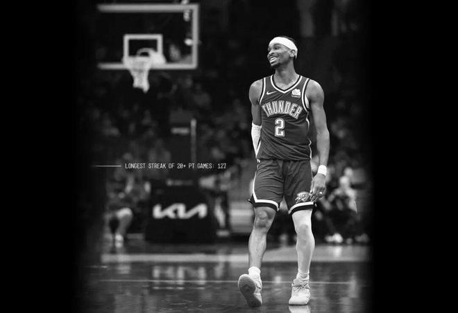 雷霆队球星 SGA 谢伊·吉尔杰斯-亚历山大以连续 127 场比赛得分 20+ 的神勇表现,正式超越篮球皇帝张伯伦在 1963 年 1 月创下的 126 场纪录,成为该项数据当之无愧的「历史第一人」。