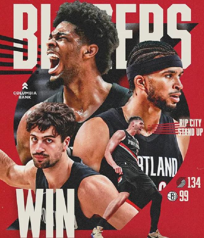 开拓者主场134-99碾压篮网,赢了35分之多,创造球队本赛季最大赢球分差。